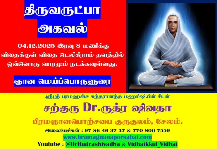 On December 4, the day of Karthigai Pournami, in accordance with the command of our Sadhguru Sri Sri Paramahansa Sundarananda Maharishi, also known as Thirumoolar Siddhar, we are pleased to announce that starting from this Full Moon day, free Brahma Jnana classes will be conducted every Thursday at 8 PM on our Vithaikkul Vidhai Telegram platform.